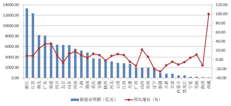 圖3 2018年上半年各地區(qū)建筑業(yè)企業(yè)新簽合同額及增速